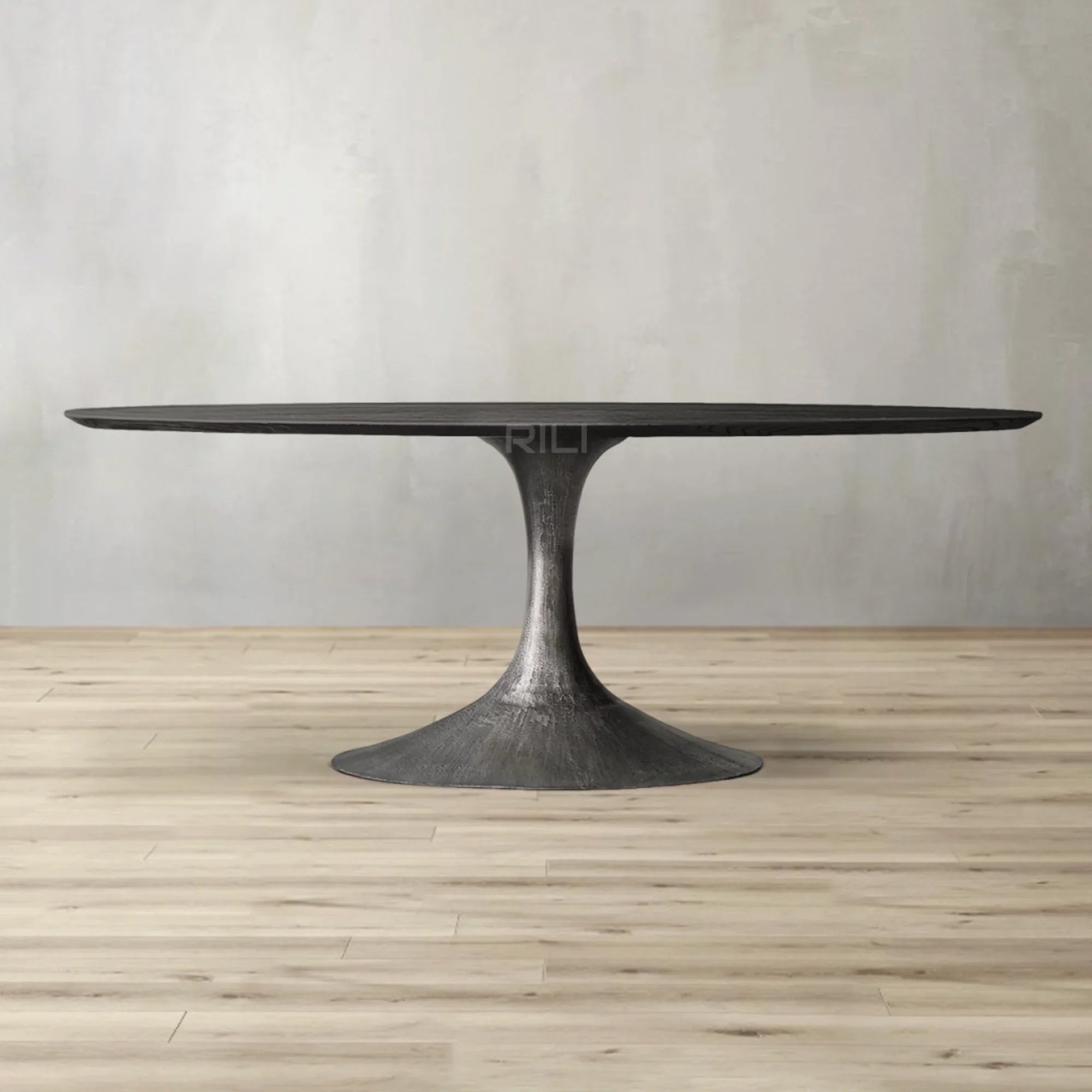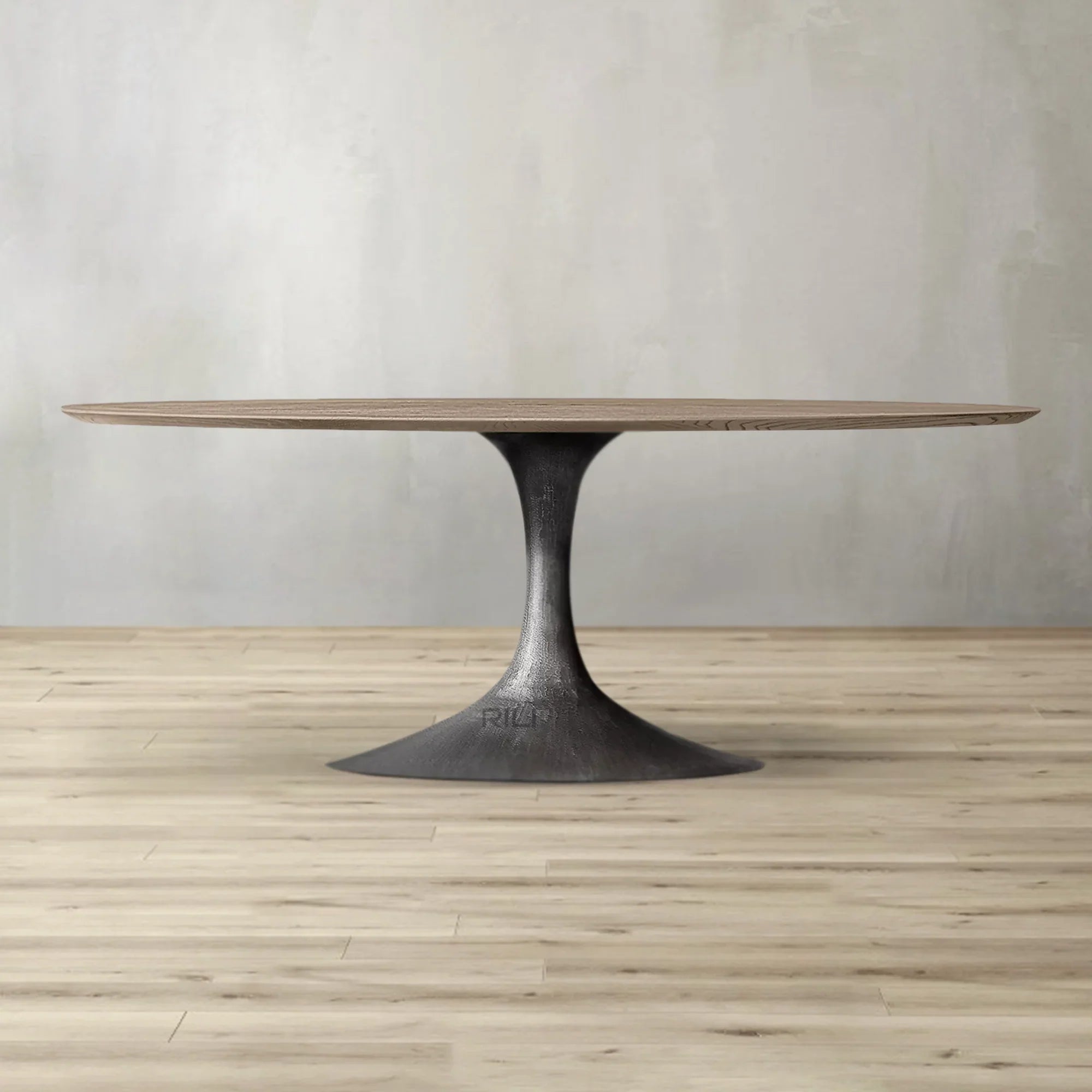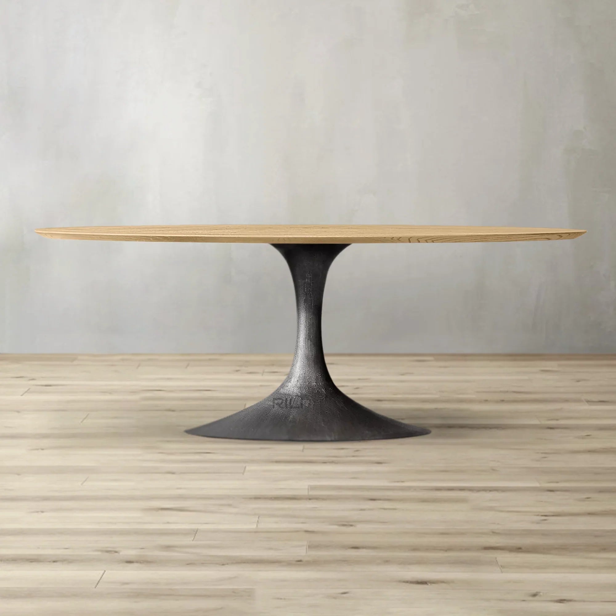 The Aero series draws inspiration from the flowing lines of mid-century design and focuses exclusively on dining and coffee tables. Balanced proportions and arched, sculptural curves define a minimalist yet confident silhouette, while a cast-steel pedestal base offers sturdy support and generous legroom. Paired with a finely beveled oak or walnut top, the restrained sheen of metal contrasts elegantly with the warmth of wood. From dining gatherings to relaxed living-room conversations, Aero carries a unified design language across sizes—light yet grounded—balancing durability with everyday tactility.
