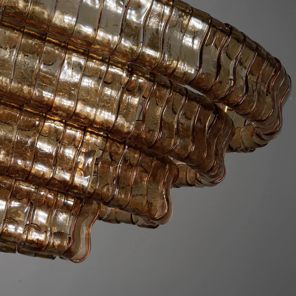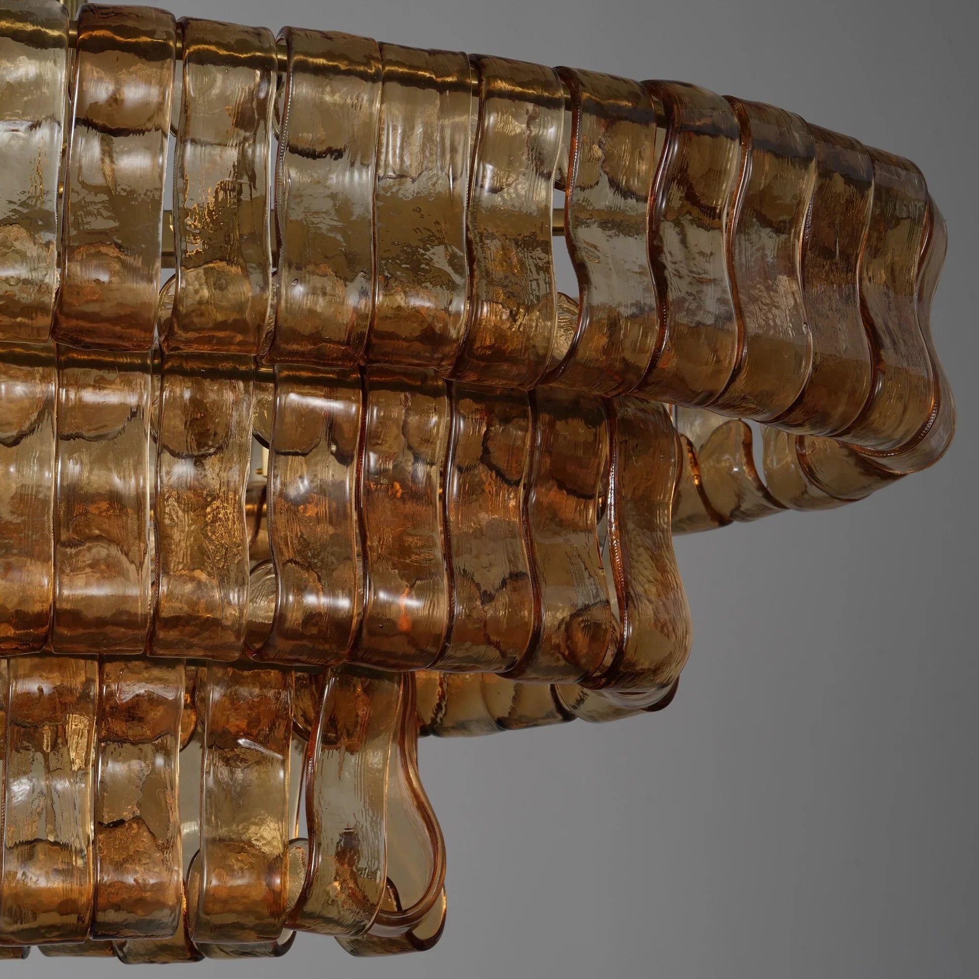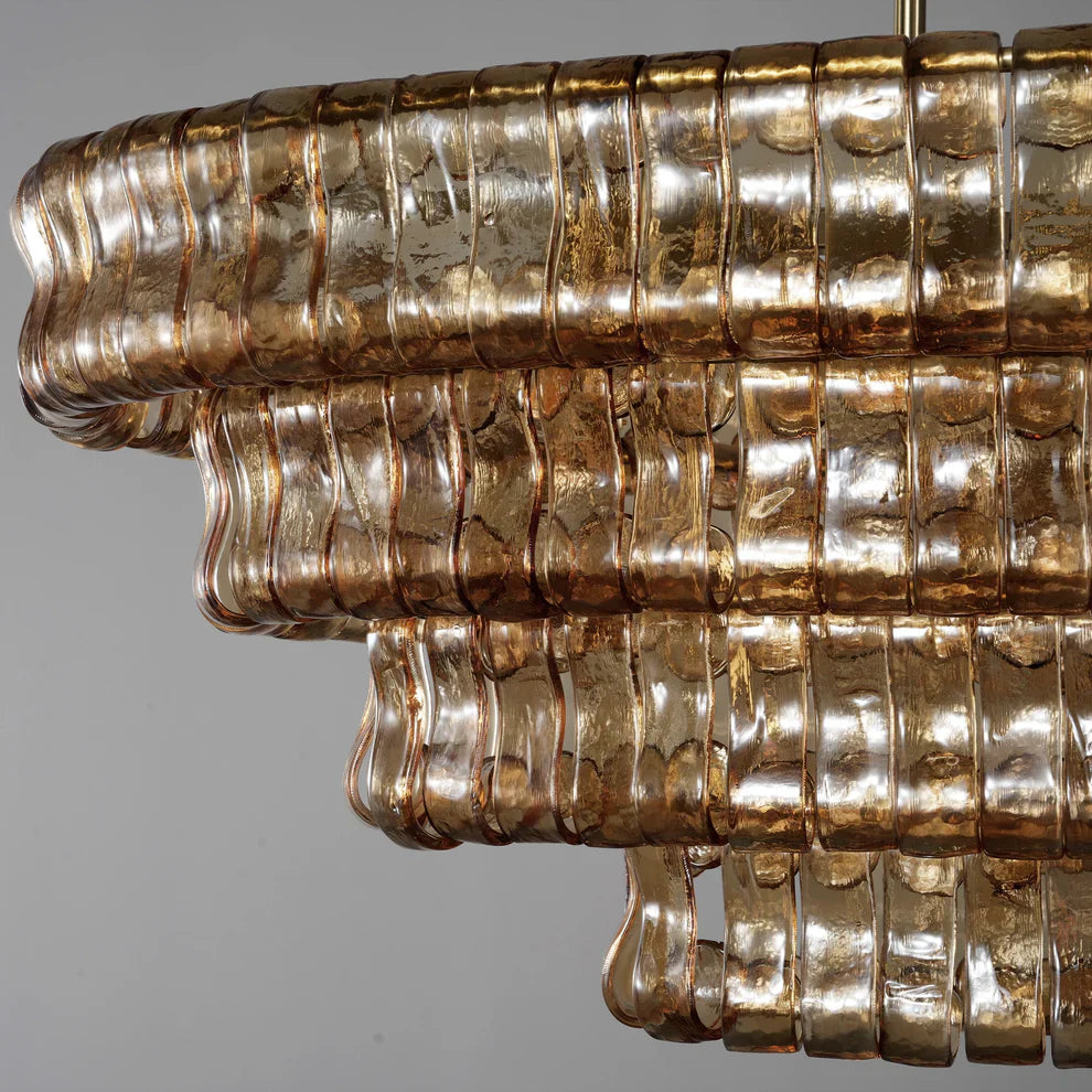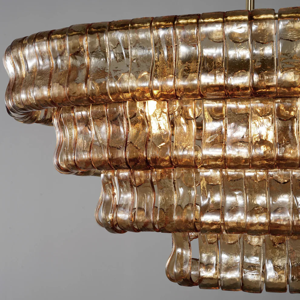 Inspired by Italy's famous decorative glass, the Lumora Art Glass Oval Chandelier 54" 65" cleverly diffuses light through curved pieces of textured glass. With its copper-plated finish, Ghiaccio elegantly brightens any room.