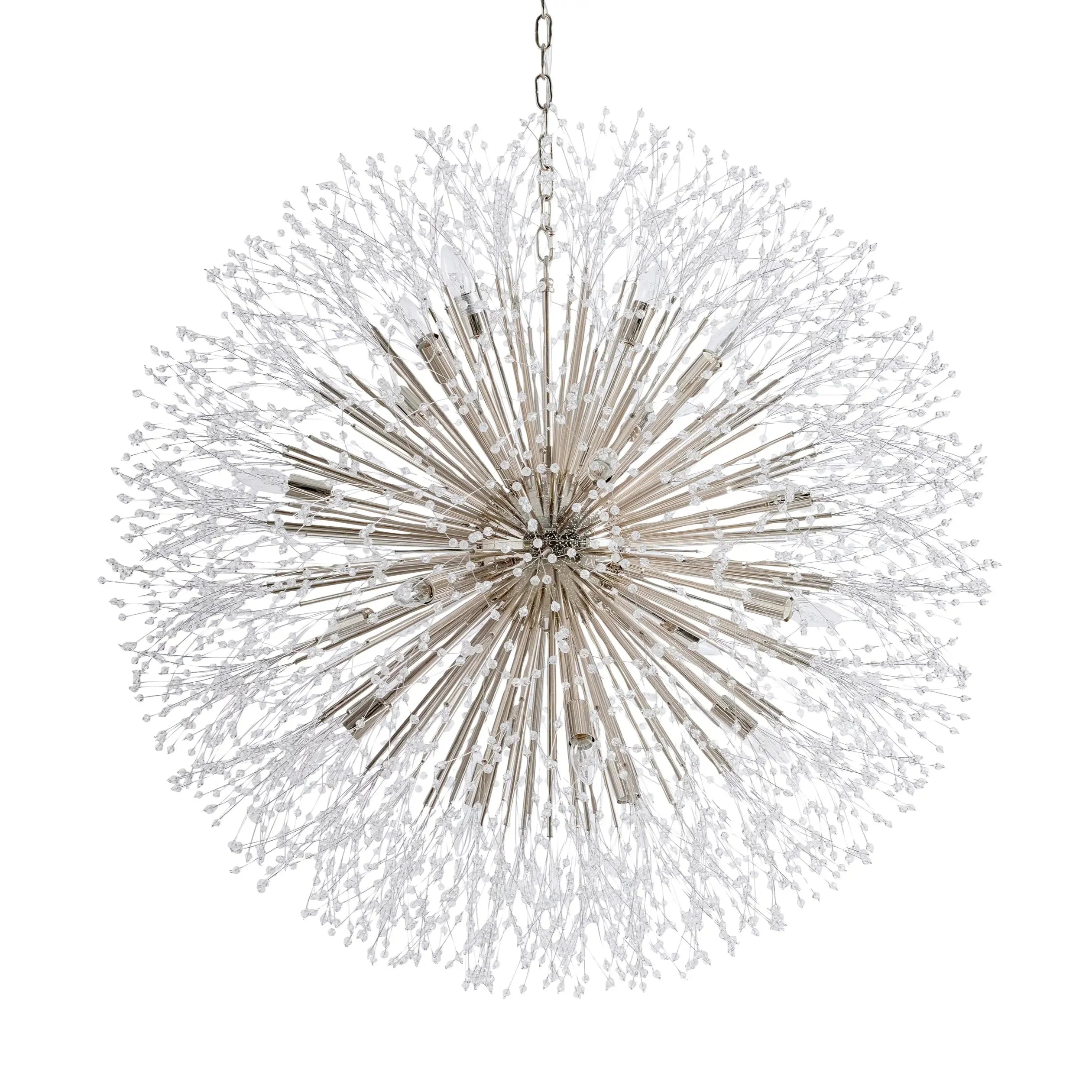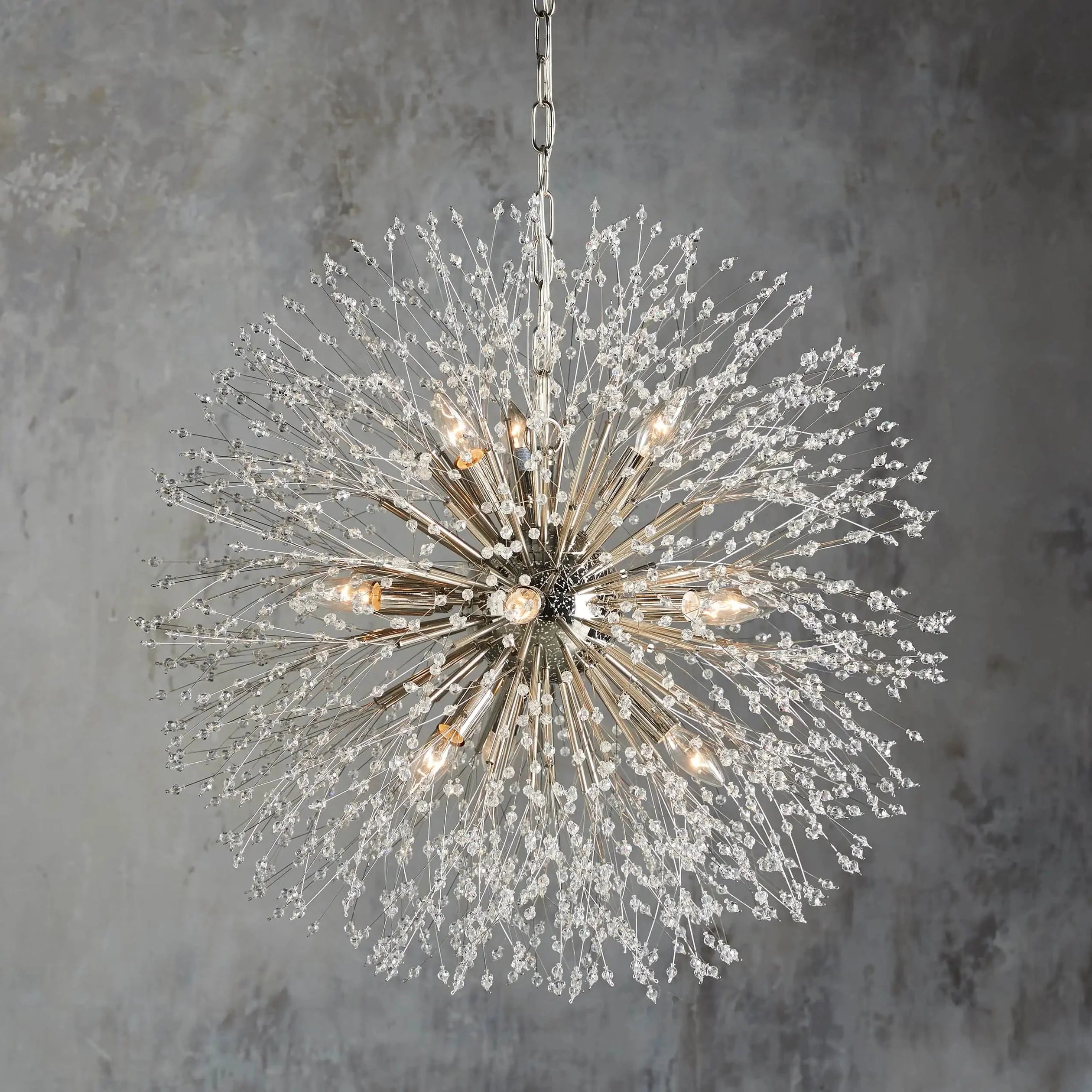 The Dandelion Round Chandelier is a captivating lighting fixture that draws inspiration from the delicate beauty of a blossomed dandelion.Crafted from nickel-plated iron with a painted finish, it features radiating crystals that reflect light, adding a whimsical touch to any space.This chandelier is available in various sizes, including 22", 30", and 43.25" diameters, each accommodating different numbers of E12 bulbs.