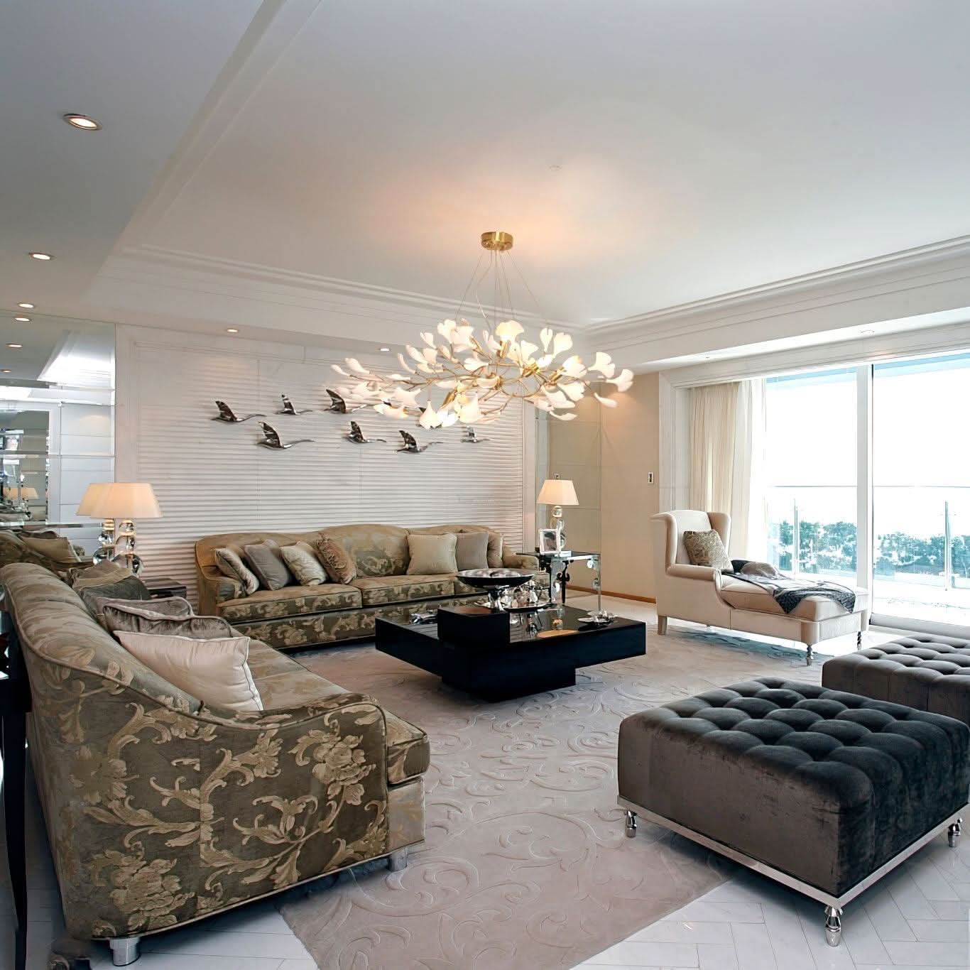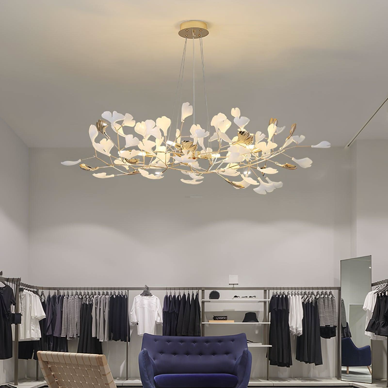 This Ginkgo Chandelier Style N combines luxury and nature, featuring a metal lamp body adorned with handmade ceramic petals. The chandelier’s unique design blends light and natural elements, creating a warm and soothing atmosphere.