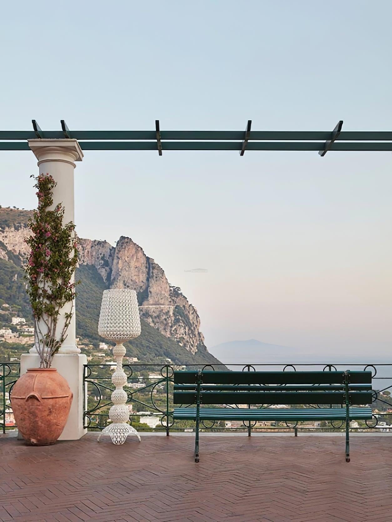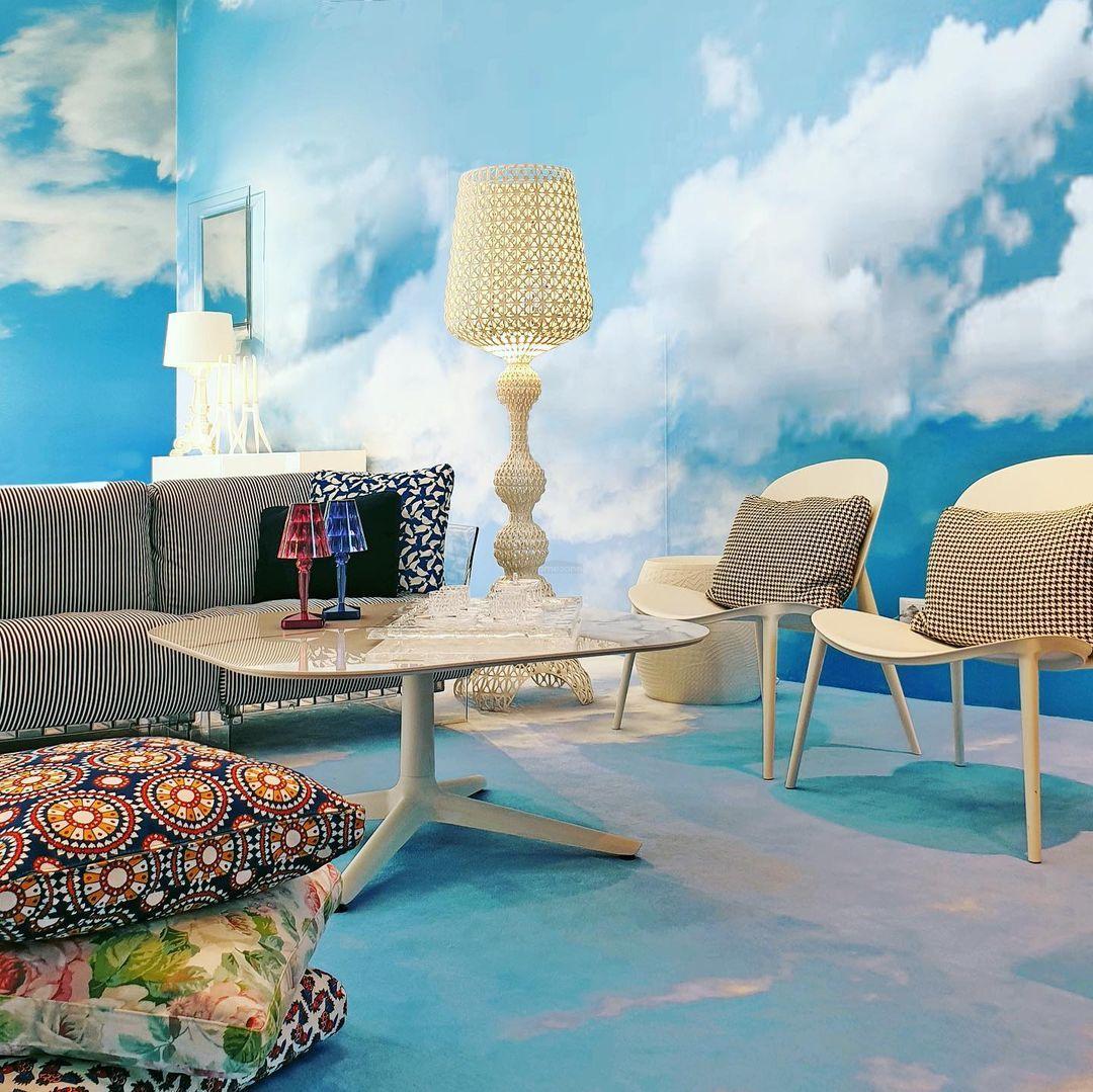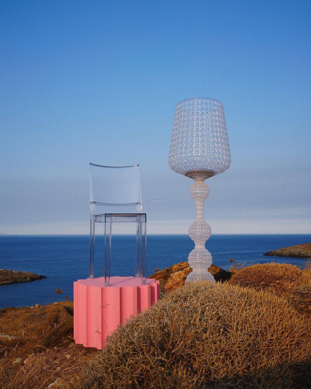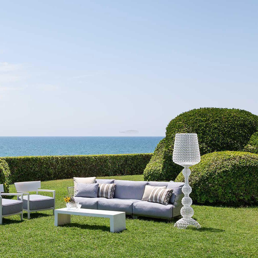 The Kabuki floor lamp series is exceptionally decorative and bathes the room in stunning light. Crafted from acrylic, it boasts an effortless and delicate appearance. Kabuki is offered in five captivating colors: blue, clear, green, white, and black.