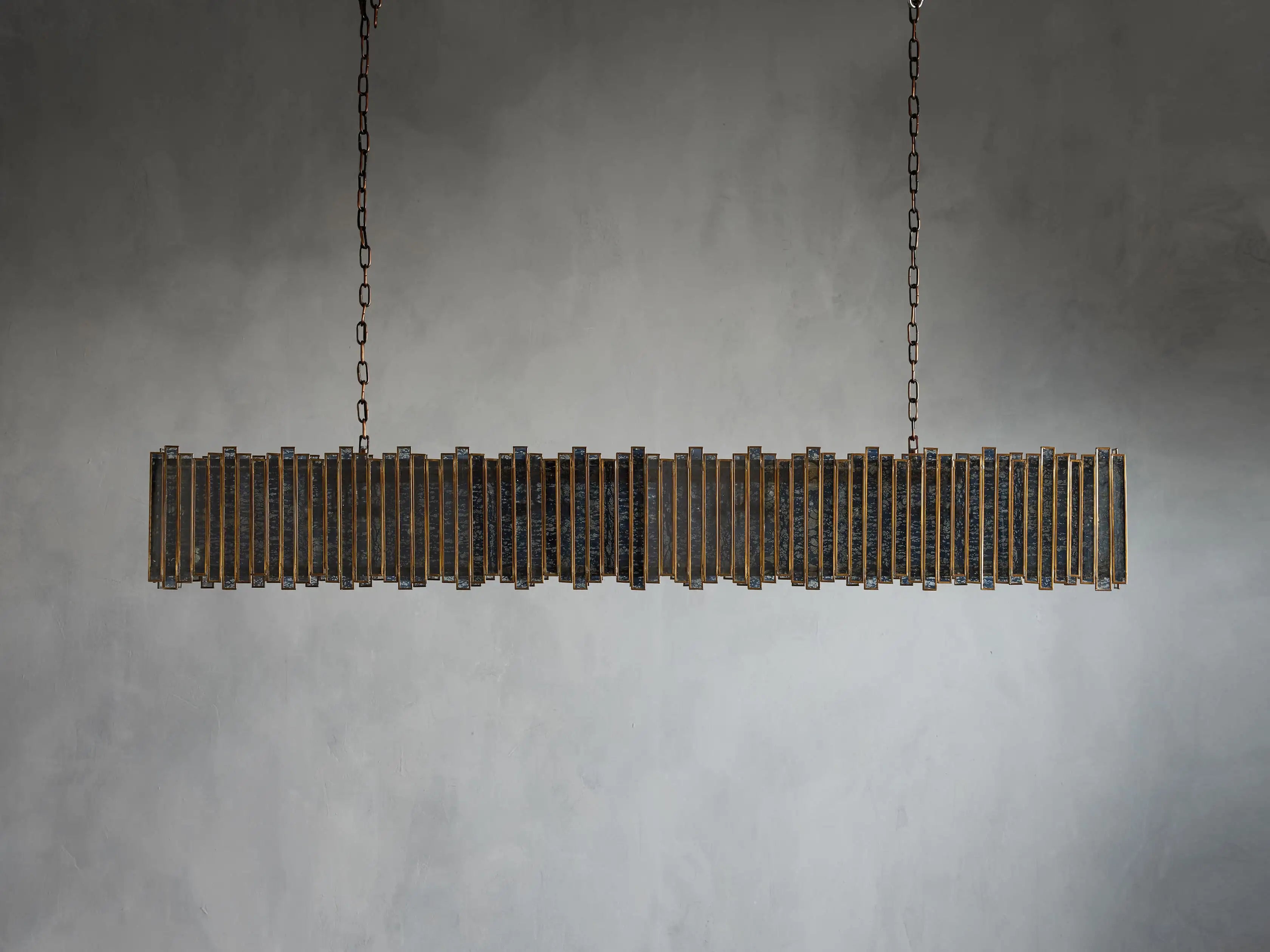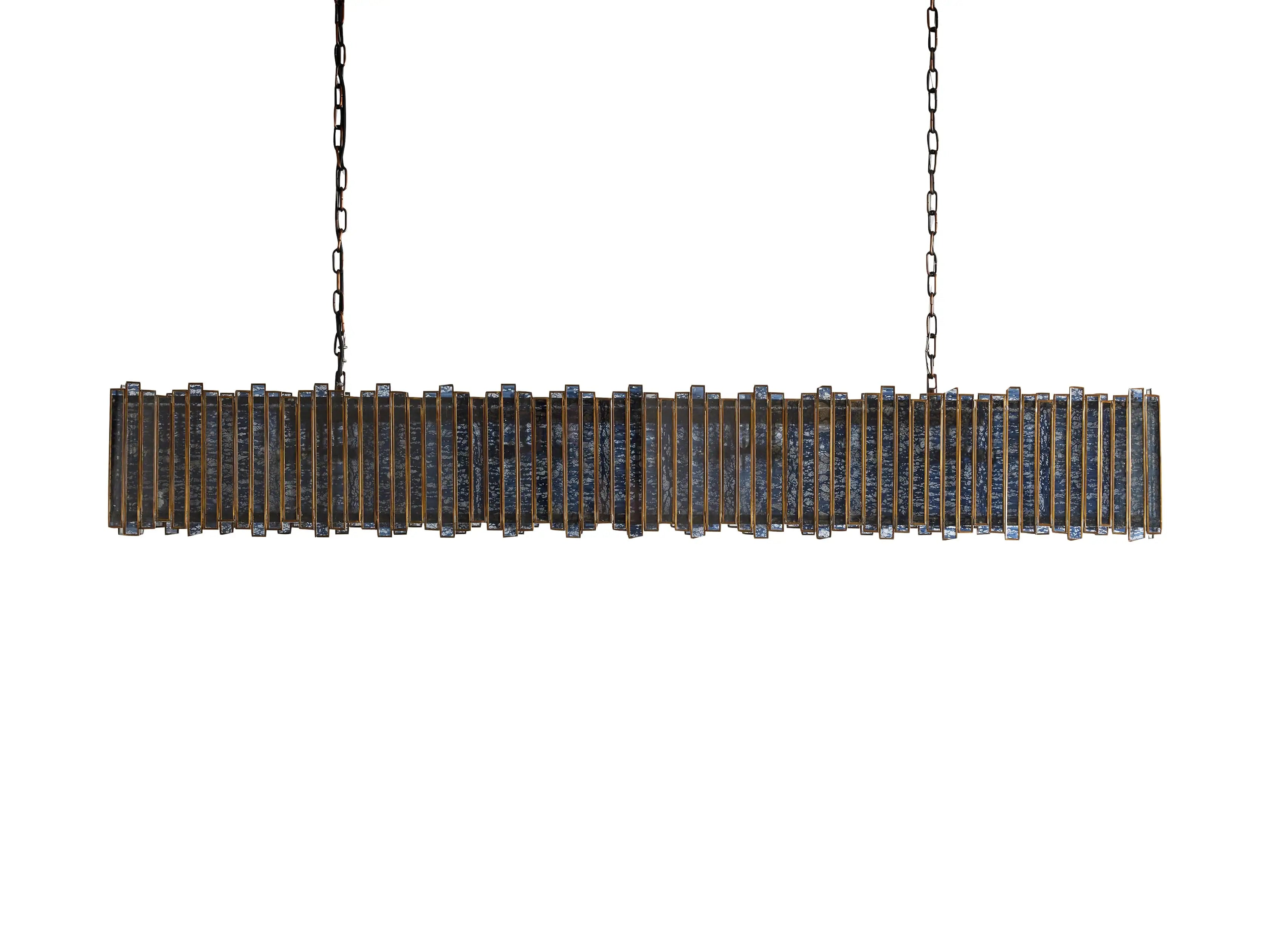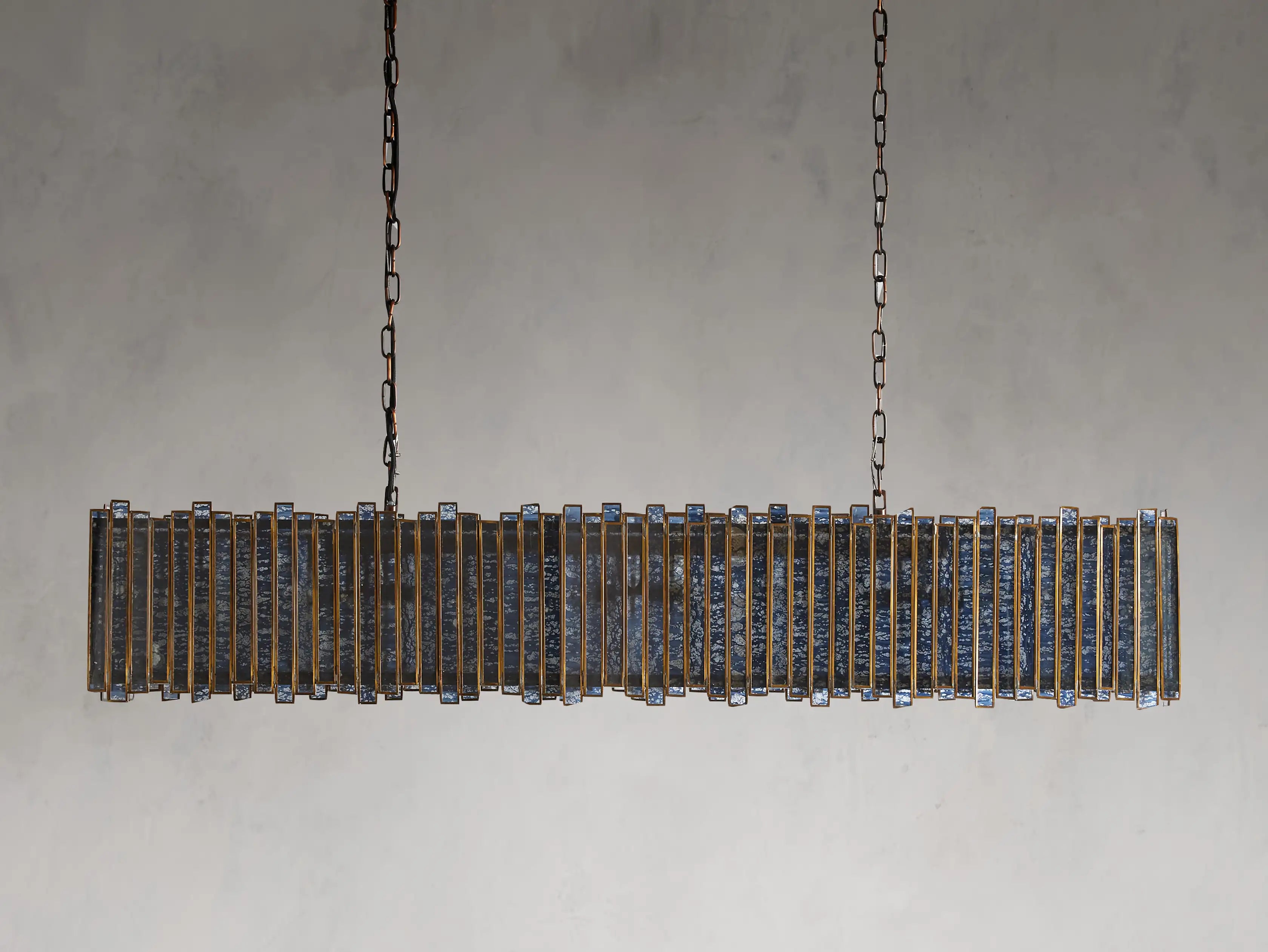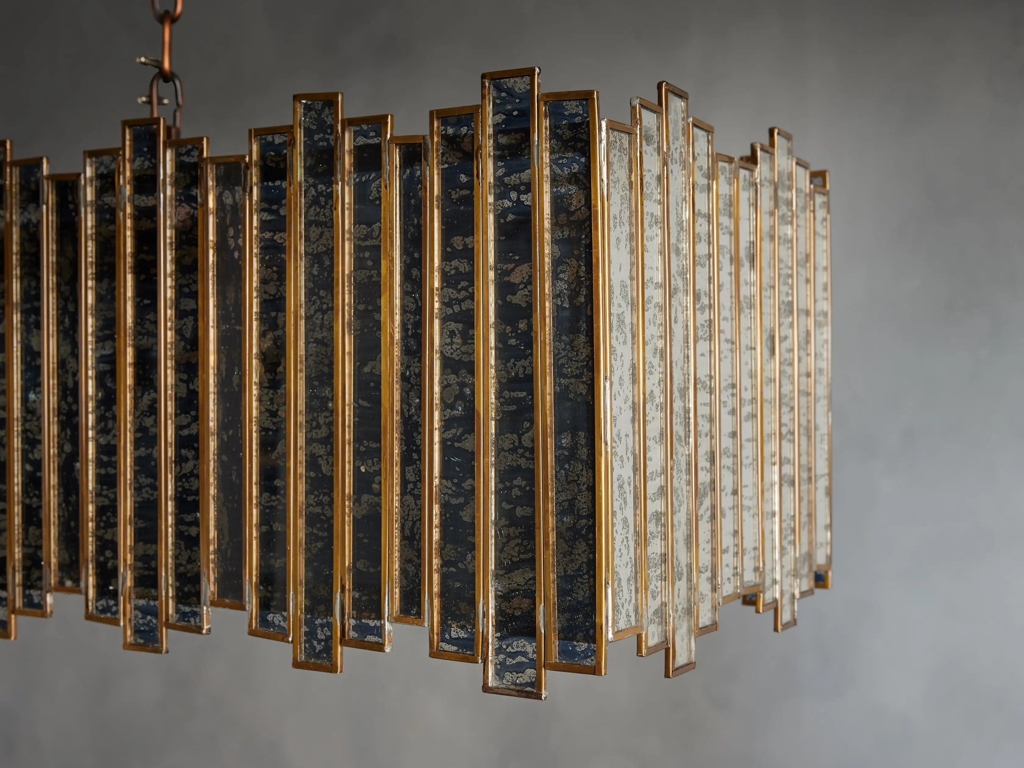 The Laila Rectangular Chandelier is a striking lighting fixture that combines vintage charm with contemporary elegance.Crafted from iron and brass, it features an Antique Copper finish complemented by antiqued mirrored-glass panes that encircle the frame.This chandelier is available in various sizes, including 37", 49", and 70" widths, each accommodating different numbers of E12 bulbs.