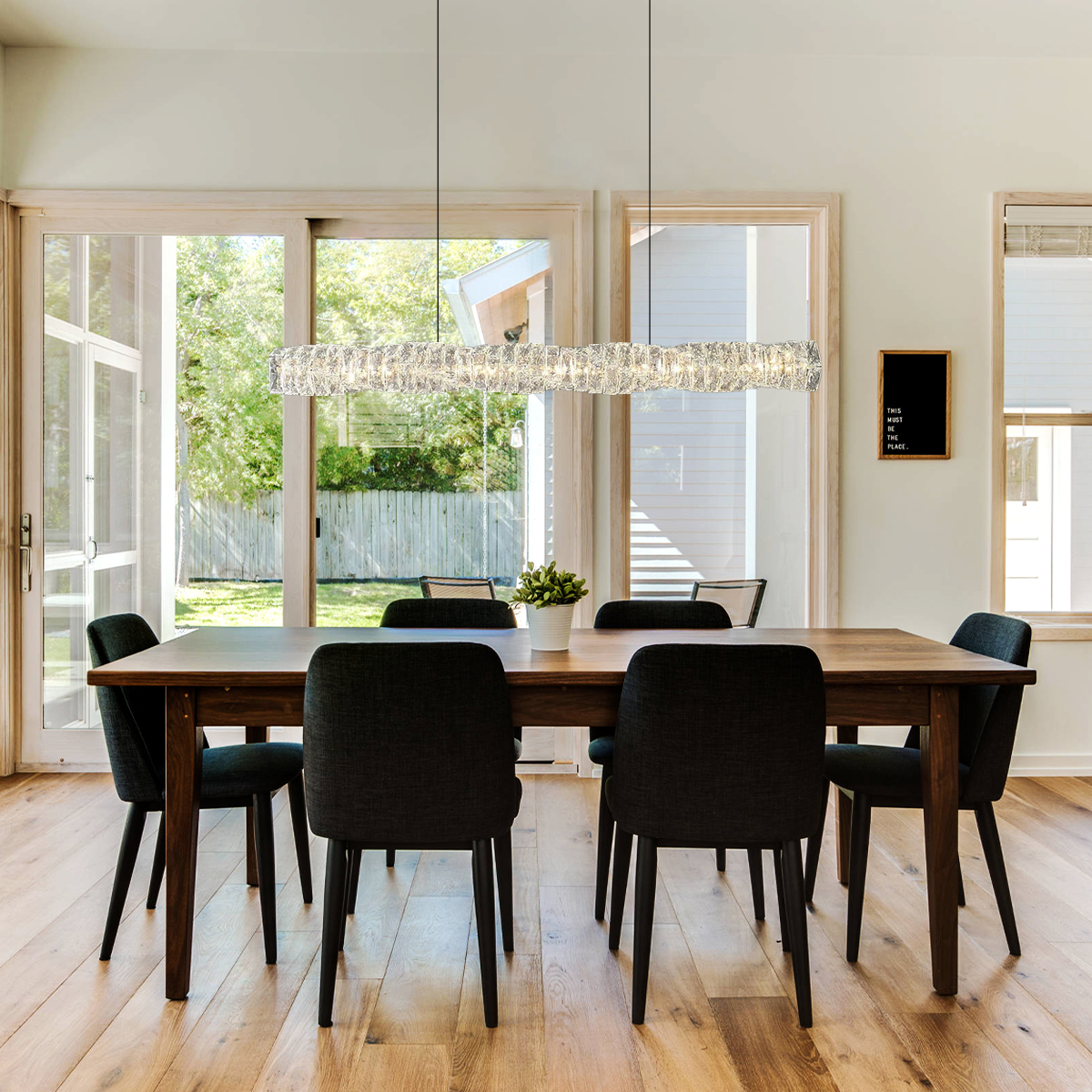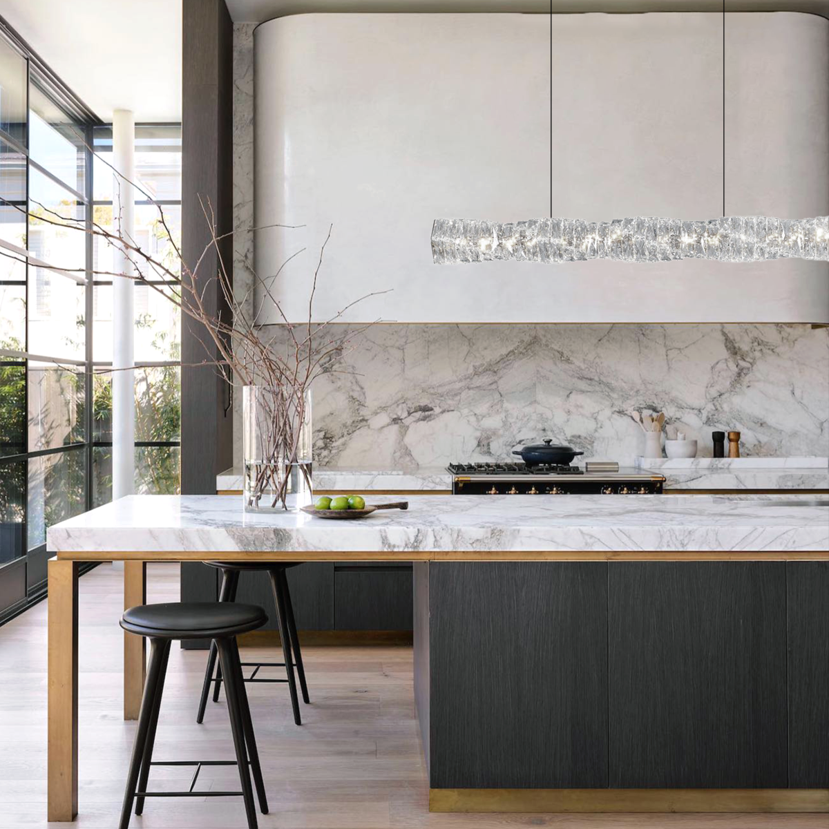 The Long Crystal Pendant Lamp is an ideal choice for illuminating long or rectangular tables, and it can also make a stunning statement above a kitchen island. Its linear shape is perfectly suited to its function. Adorned with K9 Crystal, renowned for its exceptional clarity and minimal inclusions, akin to the brilliance of diamonds, this lamp sparkles brilliantly as it refracts and reflects light.