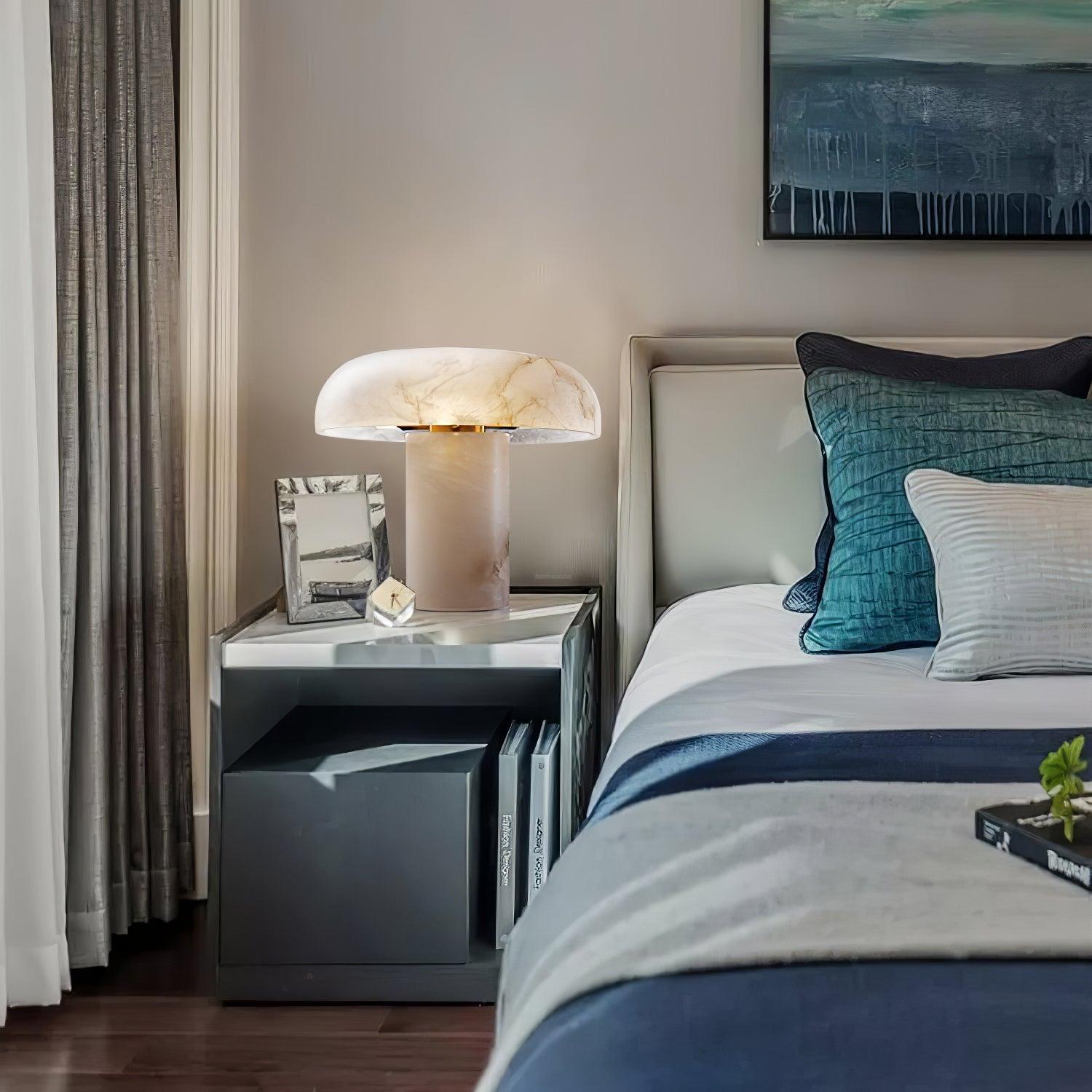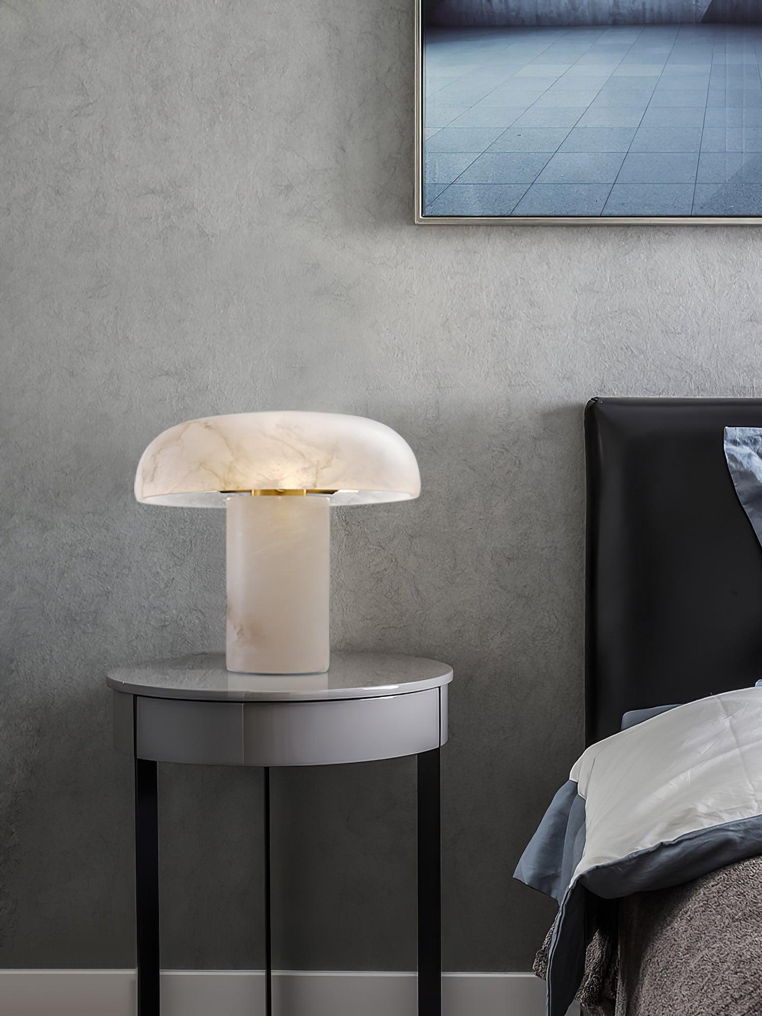 The opulent Mushroom Table Lamp, adorned with a white alabaster base, serves as an exquisite accessory for both home and office settings. Elevate lackluster spaces to refined, high-end interior decor with this luxurious table lamp. Its elegant design makes it a perfect fit for various indoor environments, including living rooms, entryways, home offices, and bedrooms.