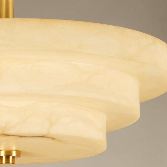 The Pershore Alabaster Semi Flush Ceiling Light is a refined lighting fixture inspired by 1930s Art Deco aesthetics. Its large-scale design features a hand-finished, stepped alabaster bowl that elegantly diffuses light, complemented by a round finial and ceiling plate. Crafted from solid cast brass and fine Italian alabaster, this ceiling light combines timeless design with exceptional craftsmanship.
