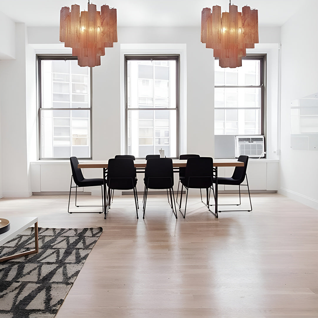 Elevate your space with the Tronchi Pink Murano Glass Chandelier, measuring 22.8″ in diameter. This exquisite fixture features 36 large alabaster pink glass tubes arranged in a striking star-shaped design. Handcrafted using traditional Murano techniques, each glass tube boasts a refined, textured finish that adds depth and elegance to the soft pink glow. A perfect statement piece for adding charm and sophistication to any interior.