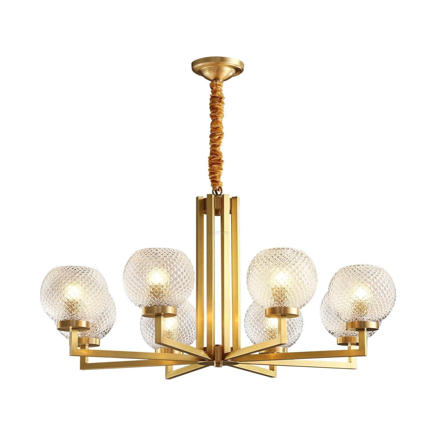 "Luxurious and breathtaking, the Ribbed Glass Brass Chandelier Φ 27.6″ is defined by its impeccably angled design. Bulbs find their elegant place within aged brass, ribbed glass orb shades, adding a touch of whimsy. The overall composition exudes a futuristic vibe with a mid-century modern influence in its styling. This captivating luminary seamlessly blends eye-catching geometry with an essence of luxury.