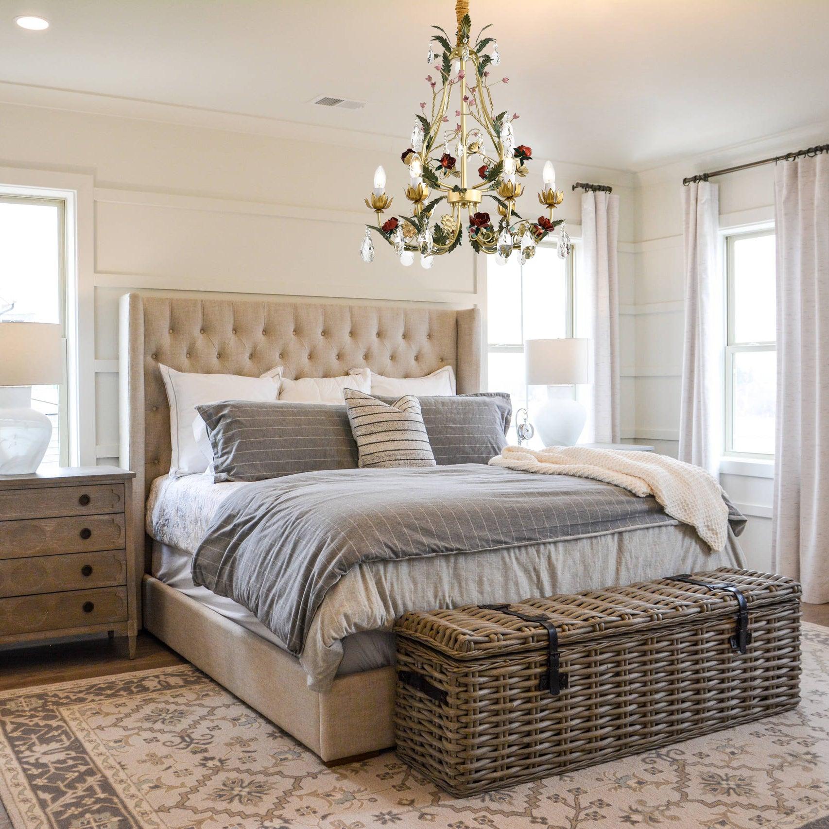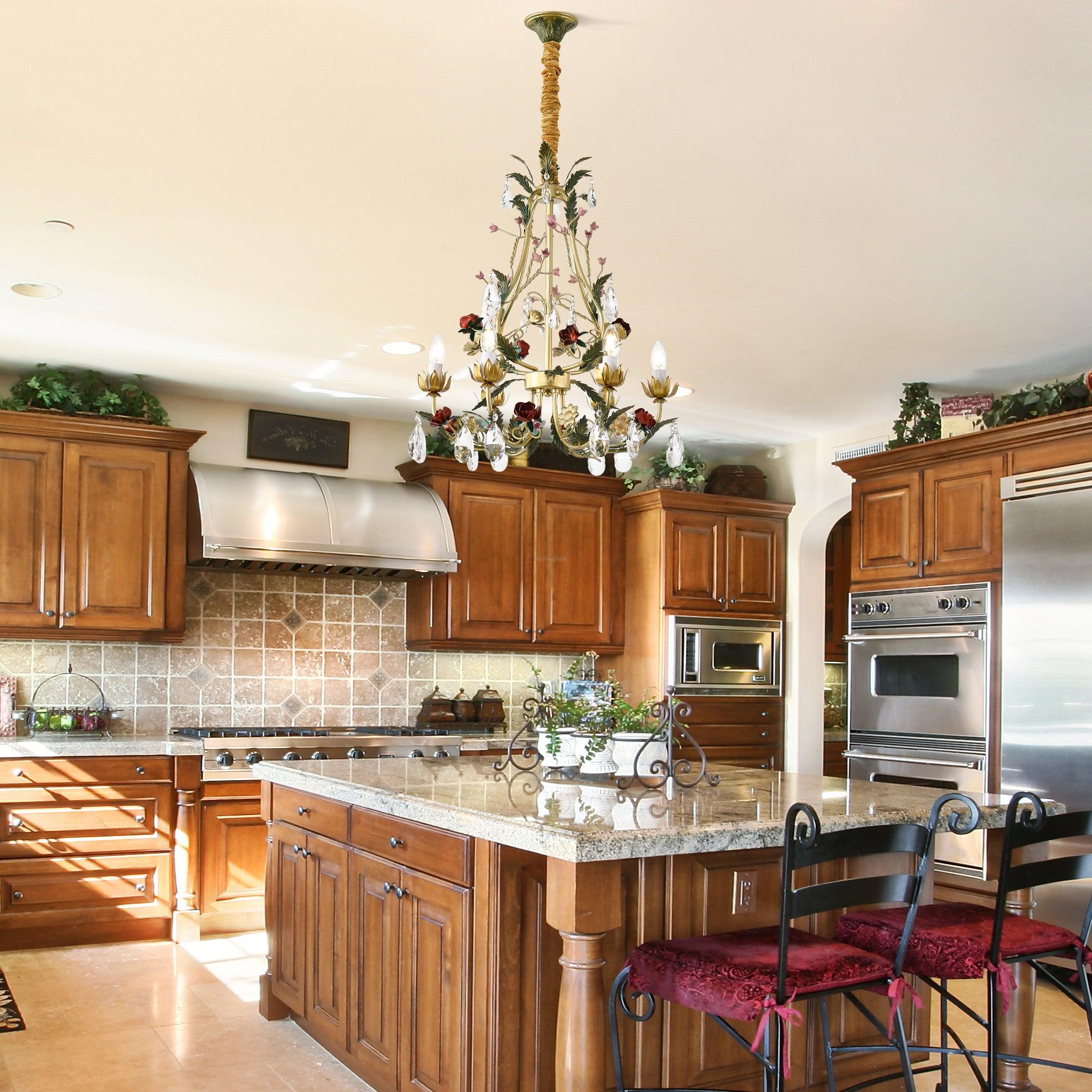 This Rose Love Chandelier with 6/8 heads presents an enchanting fusion of nature-inspired elements and exquisite craftsmanship. The framework, adorned with intricate gold-colored leaves and blossoming roses, intricately intertwines with clear crystal droplets that gracefully refract light. Enhanced by candle-like bulbs, the elaborate design emanates both sophistication and playfulness, establishing it as a striking centerpiece suitable for various interior aesthetics. Whether destined for a classic living room or a romantic bedroom, this chandelier guarantees to introduce a touch of opulence and allure to any space.
