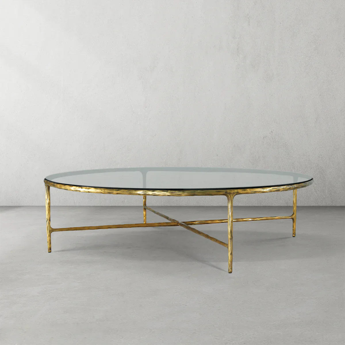 Our collection by the rustic sensibility of hand-forged metal with clean tempered glass. Employing an ancient fabrication process, artisans hand hammer the metal bars to reveal an alive, imperfect and organic texture. The pounded, tapered silhouettes are a rich counterpoint to the smooth, honed stone.