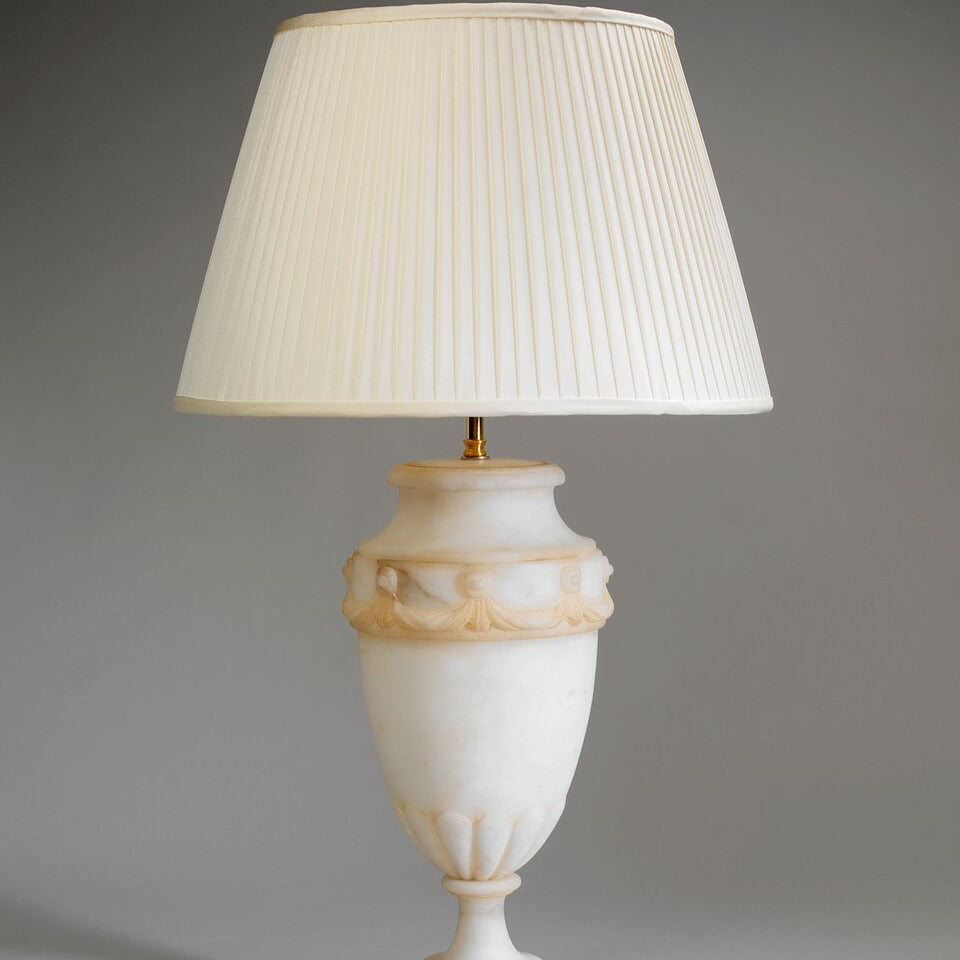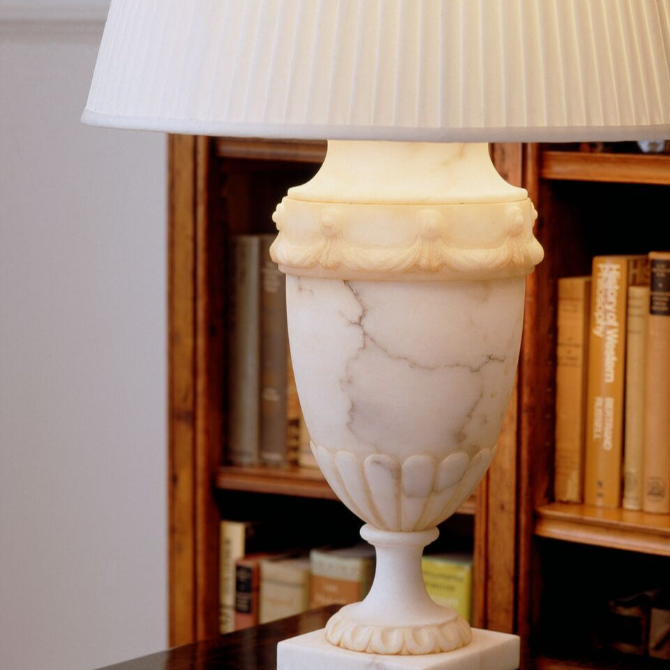 The Positano Trento Urn Table Lamp is a refined lighting piece crafted from solid Italian alabaster. Its elegant urn shape is enhanced by intricate hand-carved drape and petal detailing, showcasing the natural veining of the stone, making each lamp unique.